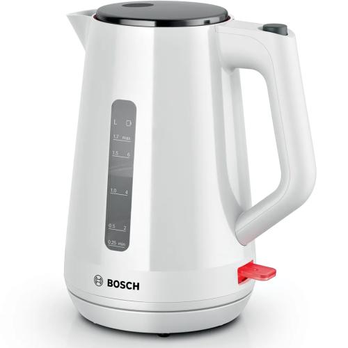 Heat water quickly and quietly with the powerful 3000 watt Bosch MyMoment Excite kettle. 360-degree base station provides easy left and right-handed use while the One-Cup indicator enables boiling just the water you need saving on water and electricity. The lid smoothly opens at the touch of a button with an easy-read water scale and a carefully designed spout ensures pouring without splashing. As the heating element and the heating tray are covered, cleaning is a breeze. Cord storage under the kettle base tidies up the kitchen counter.