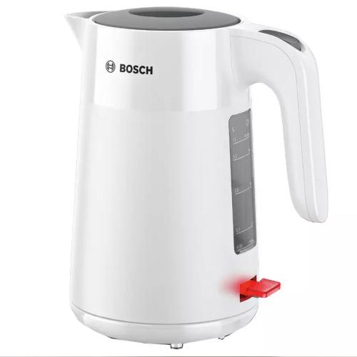 Heat water quickly and quietly with the powerful 3000 watt Bosch MyMoment Excite kettle. 360-degree base station provides easy left and right-handed use while the One-Cup indicator enables boiling just the water you need saving on water and electricity. The lid smoothly opens at the touch of a button with an easy-read water scale and a carefully designed spout ensures pouring without splashing. As the heating element and the heating tray are covered, cleaning is a breeze. Cord storage under the kettle base tidies up the kitchen counter.