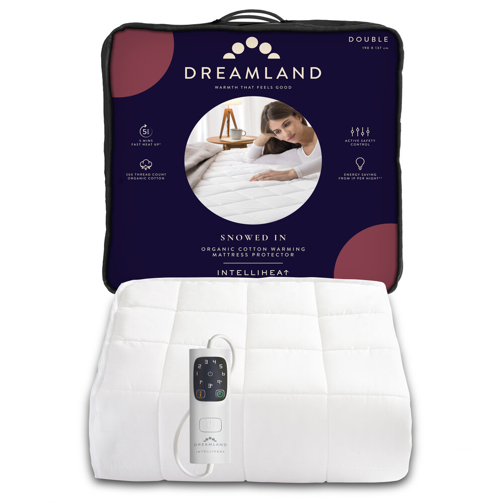 Crafted from 200 thread count sustainable, organic cotton, Dreamland's premium warming mattress protectors have cloud-like softness so you can drift off cocooned in warmth. The natural fibres keep you toasty in the winter but cool in the summer. Double size with 1 control. Easy to fit with a deep 38cm elasticated skirt. 5 minute fast heat up, 6 temperature settings and auto shut off timer. Machine washable and tumble dryer safe; simply detach the digital control.