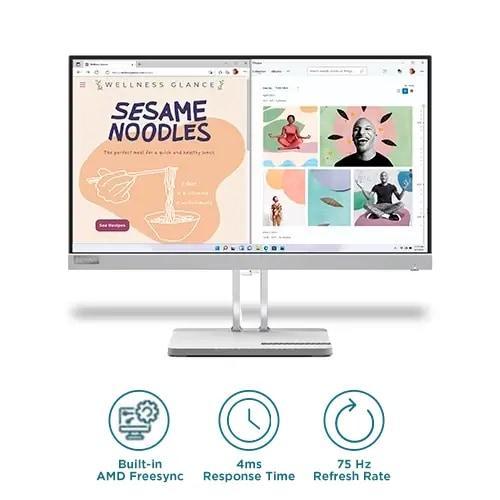 The Lenovo's L22e-40 Monitor is designed to help you get more work done while also elevating your entertainment experience. Experience a boost in productivity on the large yet contemporary, 21.45-inch inch screen. Work documents and movies for entertainment will all look crystal-clear on the display's FHD (1920 x 1080) resolution. Get a wider view of those large excel sheets with the 3-side NearEdgeless panel design. Enjoy cinematic movies and videos with your friends without having to cram in close, thanks to the wide-viewing angles of the VA panel, which produces deep, inky blacks for an even richer movie viewing experience. Its 72% NTSC color space coverage makes color-critical tasks a breeze. Support for AMD Freesync and a rapid 75 Hz refresh rate ensures that all your games run completely stutter-free and smoothly. Connecting your work or personal computers to the Lenovo L22e-40 is easy using its 1 x HDMI and 1 x VGA input ports. Whether it's meetings or movies, enjoy rich clear audio on your preferred speakers or earphones using the monitor's audio out port. Natural Low Blue Light technology eliminates harmful blue light without color distortion, so you don't strain your eyes while working. Your desk setup will look clean and contemporary with the monitor's 6.9 mm slim head design and cloud gray color. The stylish stand comes with a wave base pattern which really accentuates the overall look of your workspace. Keep your setup clean with the in-built cable management and place your phone within easy reach on the built-in phone stand. Access all of the monitor's settings with ease using Lenovo's Artery Software. Do your bit for the environment by choosing a monitor that's made with 85% recycled resin. The Lenovo L22e-40 Monitor is a great companion when it comes to getting work done with ease.