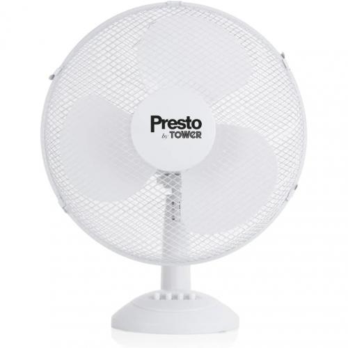 Effectively cool the air around you with this Tower Presto 16 inch 40W desk fan. Choose from up to three adjustable speed settings -low, medium or high – and get the perfect current of cool air that suits you. The fan head features an adjustable vertical tilt and rotary 80° oscillation, so you can pivot and position the airflow across a wider angle to efficiently cool different areas of the room. The white structure is supported by a stable base, with non-slip grips to enhance stability across flat surfaces. It is lightweight and includes an integrated handle, which makes it easy to carry the desk fan to other rooms. Compact in its design, this fan can be placed on your desk in the office, bedside table or kitchen countertop at home, providing added versatility during the summer months. The poly coated guard provides safety and protection when the fan is in use; while the extra-long 1.5 metre power cable gives you the freedom to put the desk fan in various locations around the room.