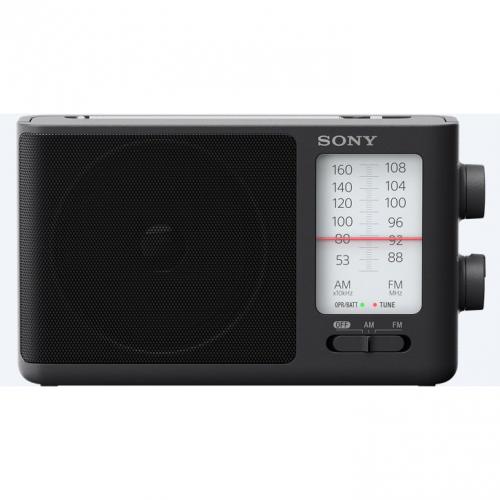 Portable AM/FM analogue radio with built-in carrying handle, headphone socket and AC adaptor.