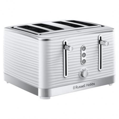 The Russell Hobbs 4 slice Inspire white toaster has a unique premium textured design complemented by sleek chrome accents making it the perfect match for tasteful interior. With variable browning control and a range of features you are guaranteed your perfect slice.