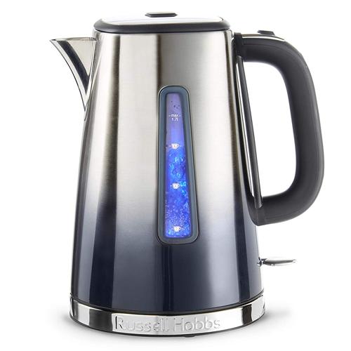 Combining advanced features with unique style the Russell Hobbs 25111 Eclipse Quiet Boil Mid Night Blue Kettle features a gradual blend of colour, rapid boil zone, 1 / 2 / 3 cup cup volumes, 45 seconds boil time for 1 cup, perfect pour water spout, concealed heating element, removable and washable filter, 360 degree base, cord storage and an easy push button to open lid.