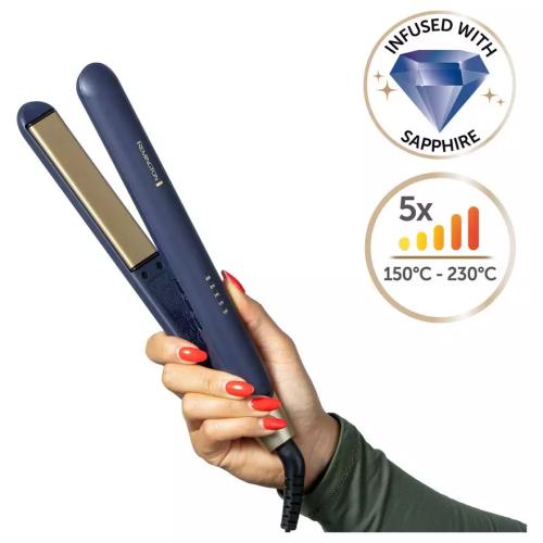 Add a touch of luxury to your styling routine with the Remington Sapphire Luxe Straightener. Designed with a decadent deep blue finish with champagne accents, it has sapphire infused advanced ceramic coated plates that leave hair 2X smoother* for sleek results. A digital temperature control with five handy settings allows you to select the right temperature for your hair type. The curved casing makes it easy to create curls and waves as well as straight looks, while the floating plate applies even pressure across the hair as you style for a consistent result from root to tip.