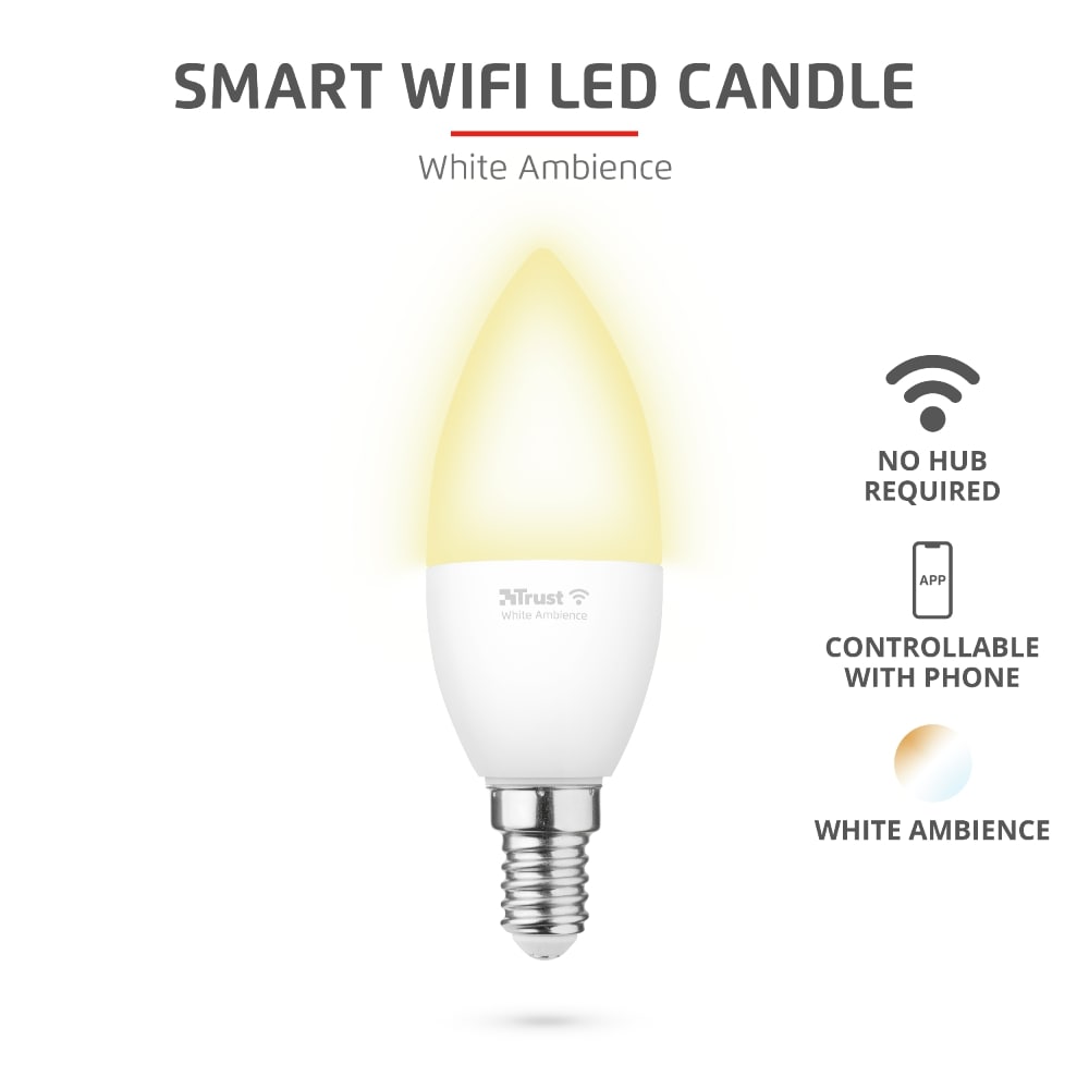Smart WiFi LED candle white ambience E14 that can be controlled with your phone/tablet. Connection via WiFi (2.4GHz), no hub required.
