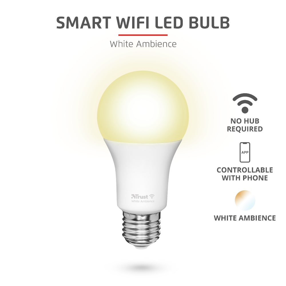 Smart WiFi LED bulb E27 white ambience that can be controlled with your smartphone. Connection via WiFi (2.4GHz), no hub required.